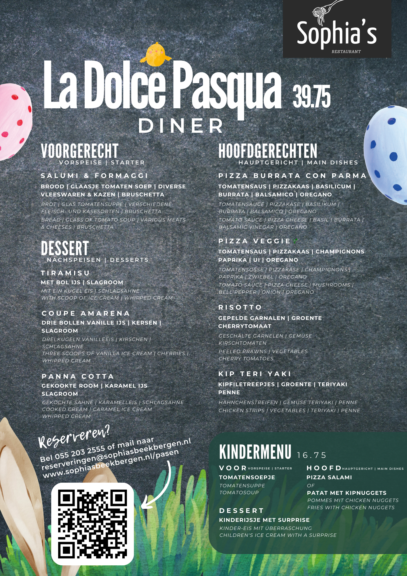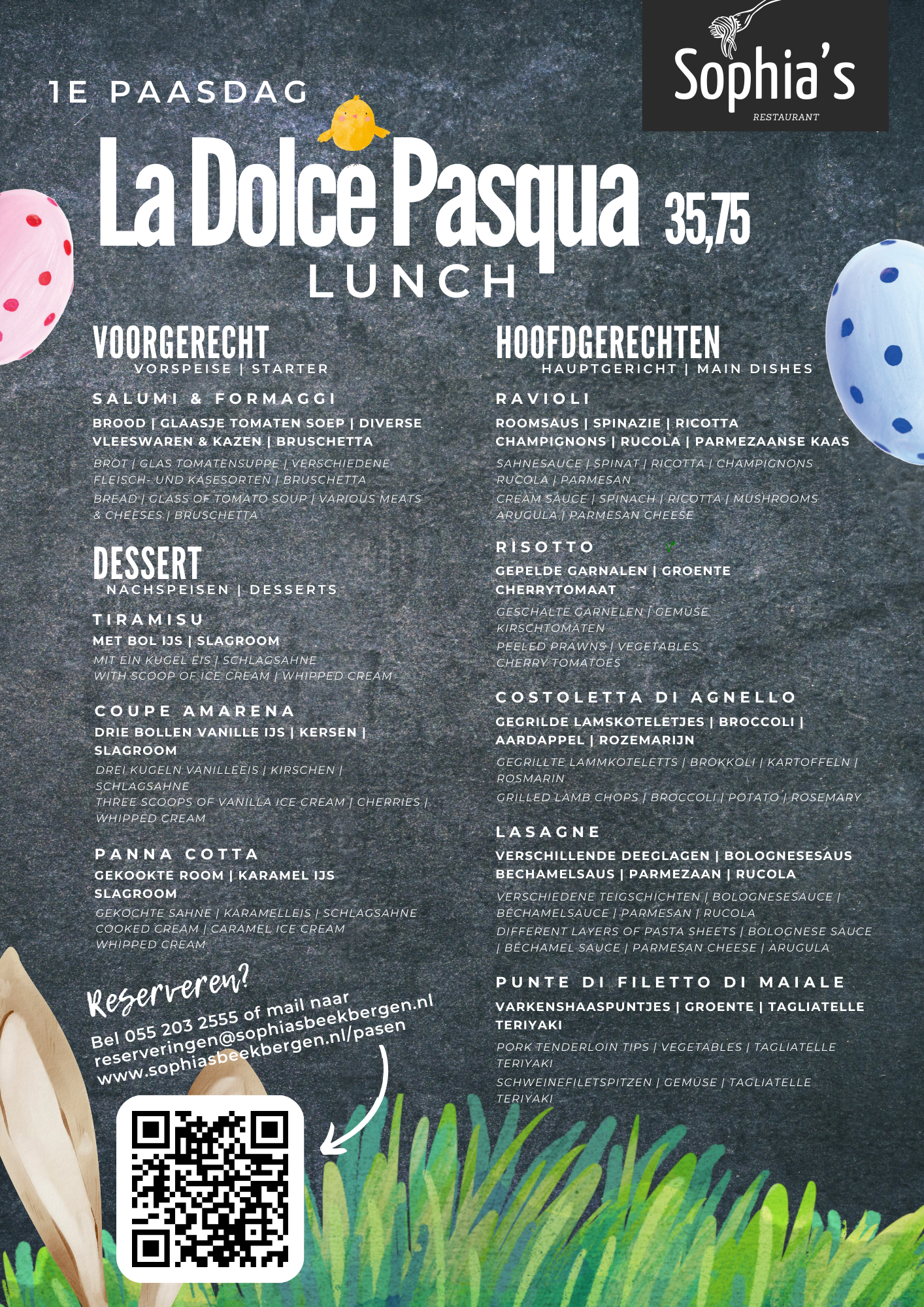 Kom gezellig samen genieten van een authentieke Italiaanse paaslunch of diner bij Sophia’s. Zorg dat je op tijd reserveert, want de plaatsen zijn beperkt!